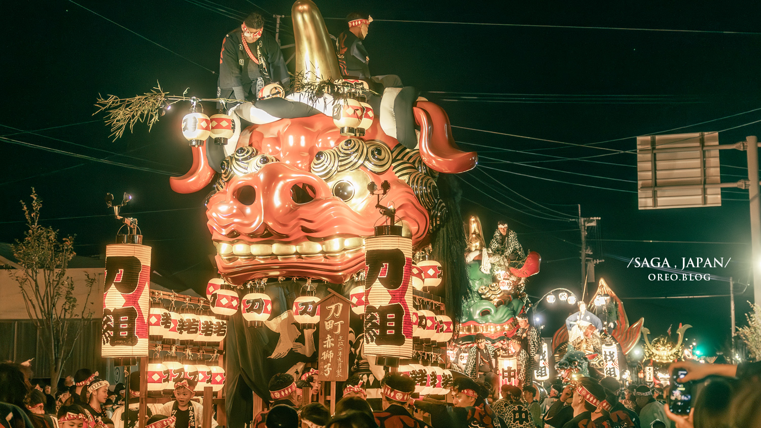 ▲14台曳山裡面,最受歡迎的就是第5台的鯉魚王了!欸不是,人家是鯛魚啦!是魚屋町在1845年製作的曳山(就是山車的意思),祭典過程會持續一整個晚上,隊伍會繞行在唐津市中心的每個街角,特別是在狹窄的街道轉角處,他們會用盡全力在轉角處甩尾!非常熱鬧,聽到群眾歡呼的聲音我就知道那邊的畫面一定很棒!但很可惜我們第一次參加沒有想到要在轉角處事先佔位子等待,太晚去的話會直接被火爆的群眾大聲轟走!應該是說我們也不知道在哪邊拍效果會最好,最後變成到處跑來跑去的!