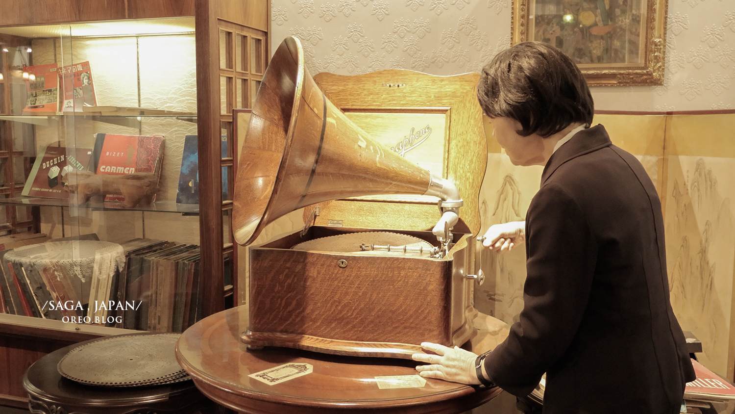 ▲有興趣的話可以請飯店人員幫忙演奏,我是第一次聽到這種復古機器播放的聲音,當下雞皮疙瘩都起來了!特別是聽到日文版的夜來香!照片中的是鐵盤挖洞的那種水晶音樂,另外還有黑膠唱片,兩種唱盤這台機器都能播放很厲害!飯店人員說這台是1910年的美國製造,有些唱片盤已經快要不行了聽起來咿咿呀呀的,播放起來也容易失敗,保存上真的是很不容易啊!
