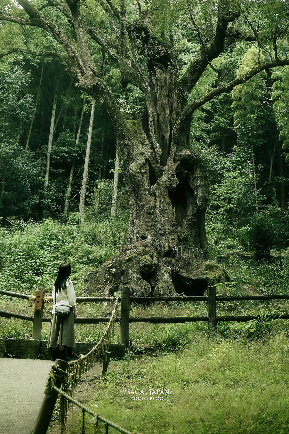 ▲樹齡3000年的大楠樹與我,樹下有看到大家敬奉給大楠樹的御神酒,日本人相信萬物皆有靈,看著照片我也覺得大楠樹好壯觀!